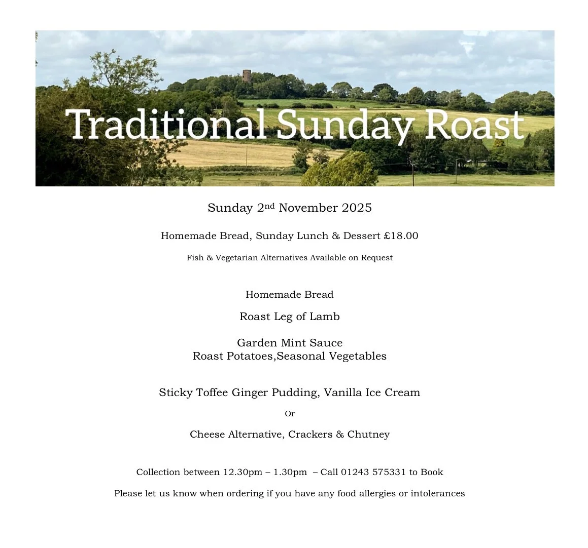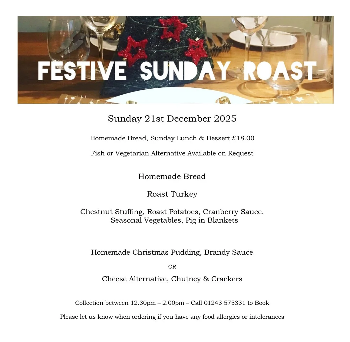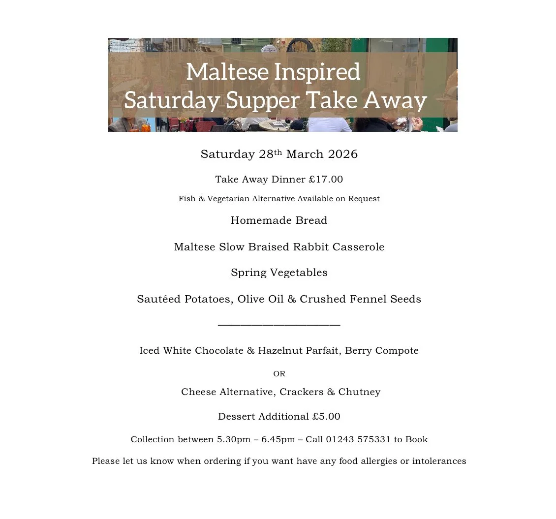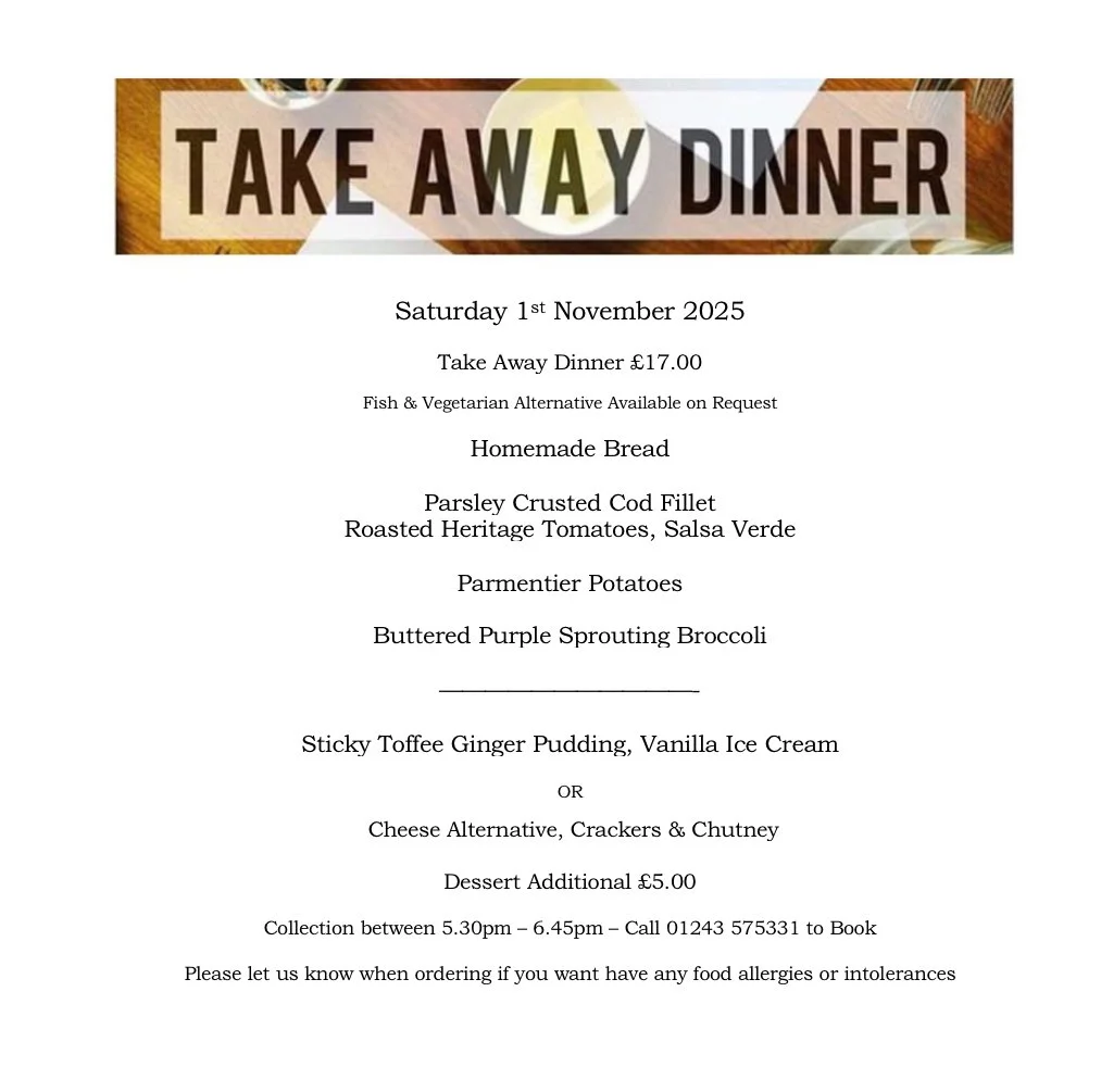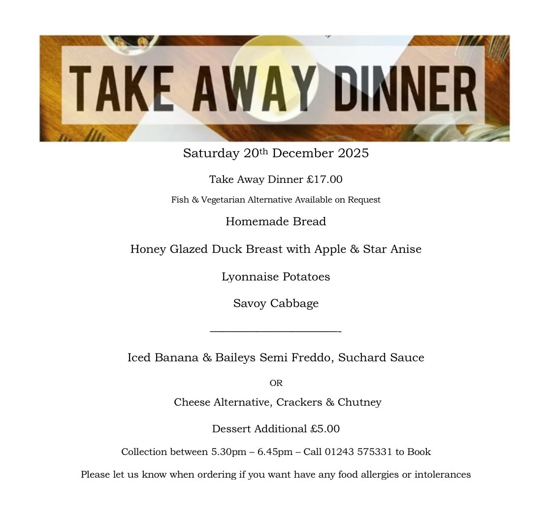 We are now running a Take Away menu along side our normal restaurant service. Our Take Away changes weekly for any enquires or bookings please contact us or phone 01243 575331